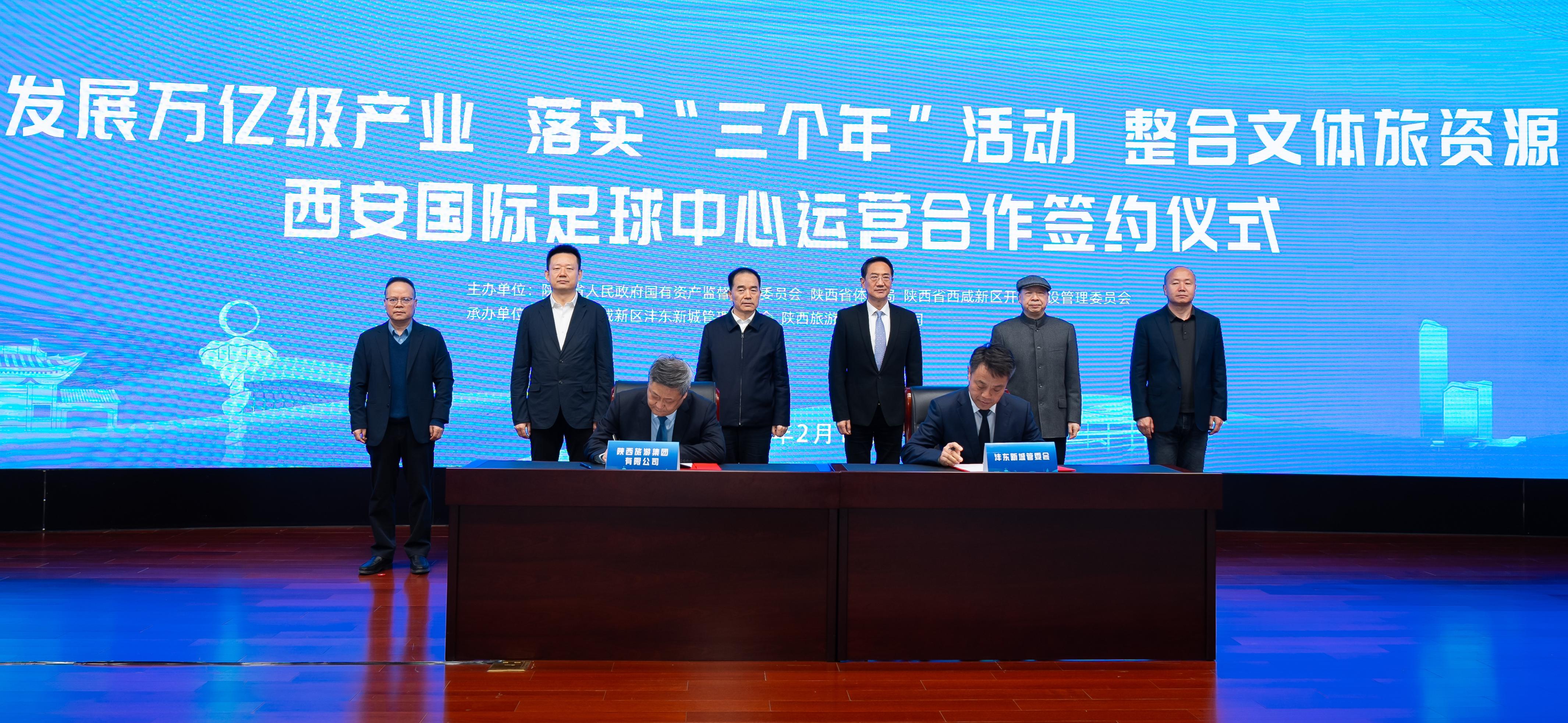 今天上午,發展萬億級產業 落實“三個年”活動 整合文體旅資源 西安國際足球中心運營合作簽約儀式在陜西省國資委隆重舉行。省國資委黨委書記任國,西咸新區黨工委書記楊仁華,黨工委副書記、主任齊海兵,陜旅集團黨委書記、董事長周冰,西咸新區黨工委委員、灃東新城黨委書記、管委會主任劉宇斌,中國虹橋集團董事長李大燦,陜西省足球協會副主席、秘書長許志勇,陜旅集團黨委委員、副總經理賀東,副總經理吳斌等出席儀式。陜旅集團黨委副書記、總經理陳小軍主持儀式。